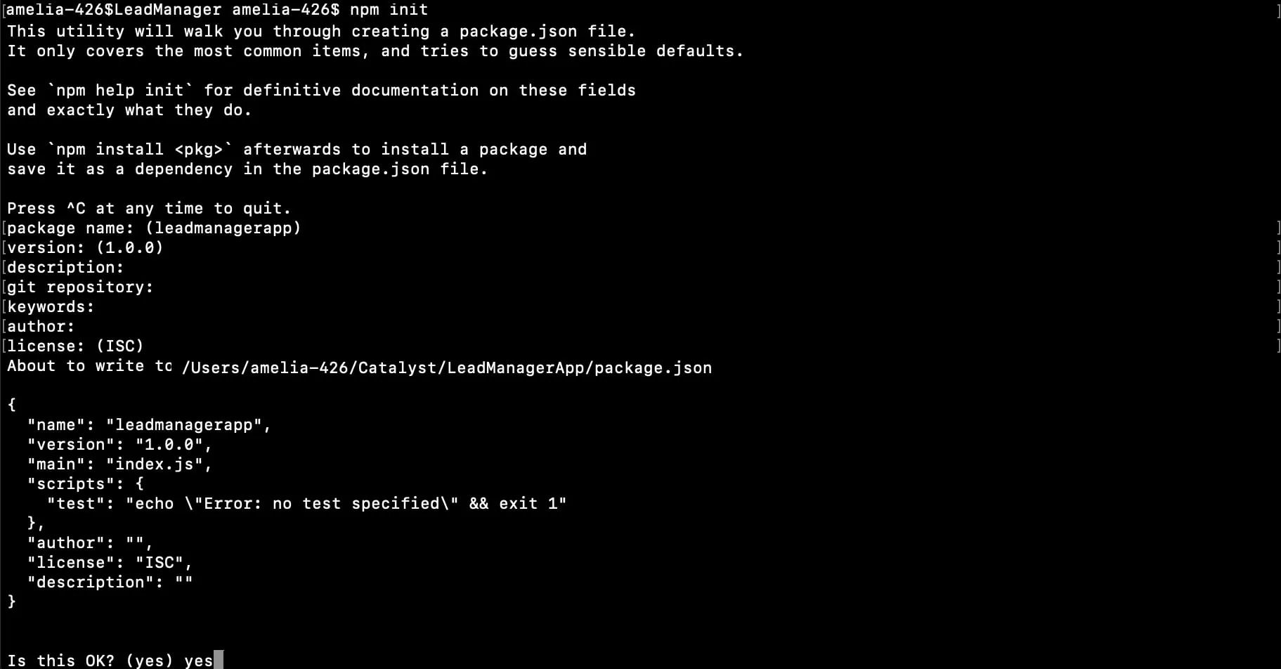 Click Enter for the rest of the prompts, and complete the initialization. Your preferences will be stored in a package.json file. You can review your options in the terminal and confirm your preferences by entering “yes”.