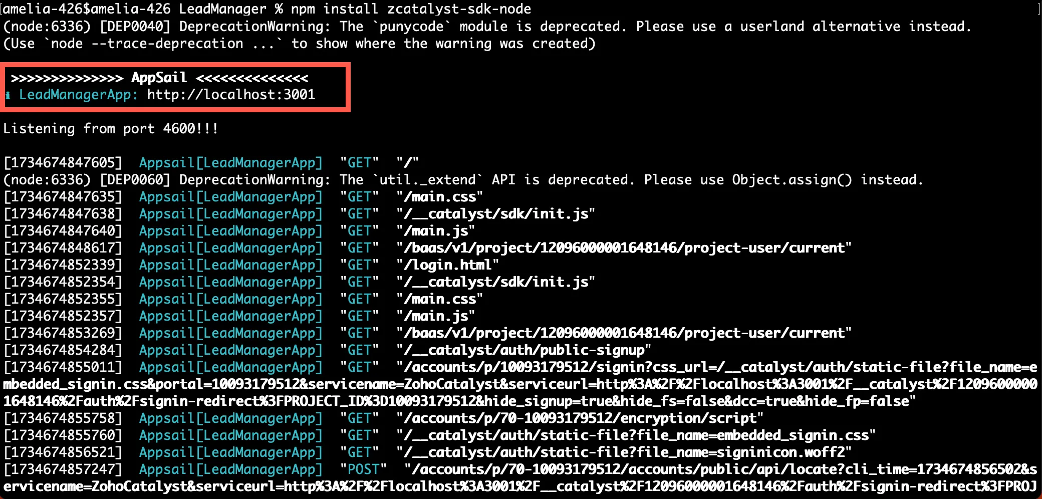 The Lead Manager application will now be served at default port 3000. The local endpoint URLs of the components are displayed.