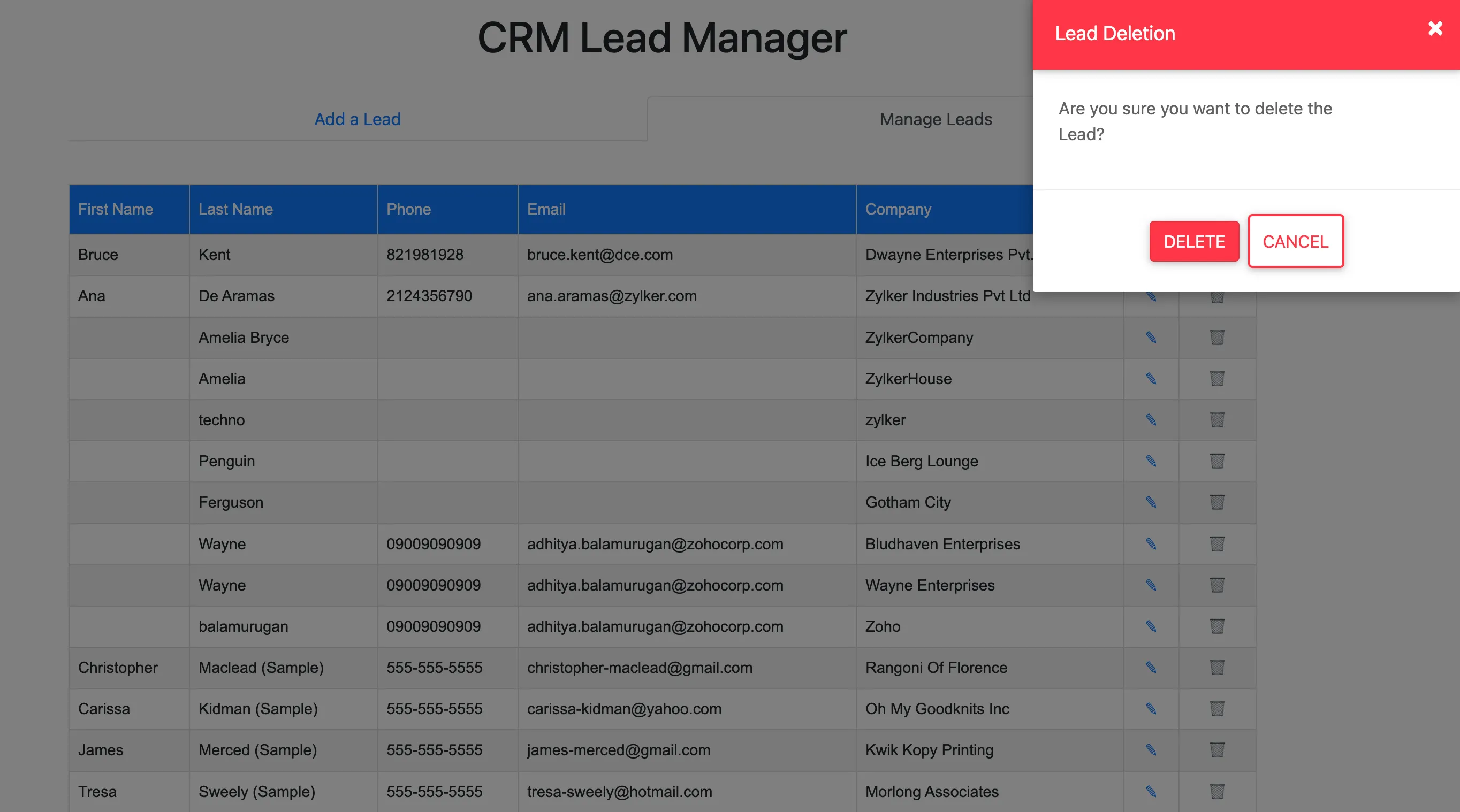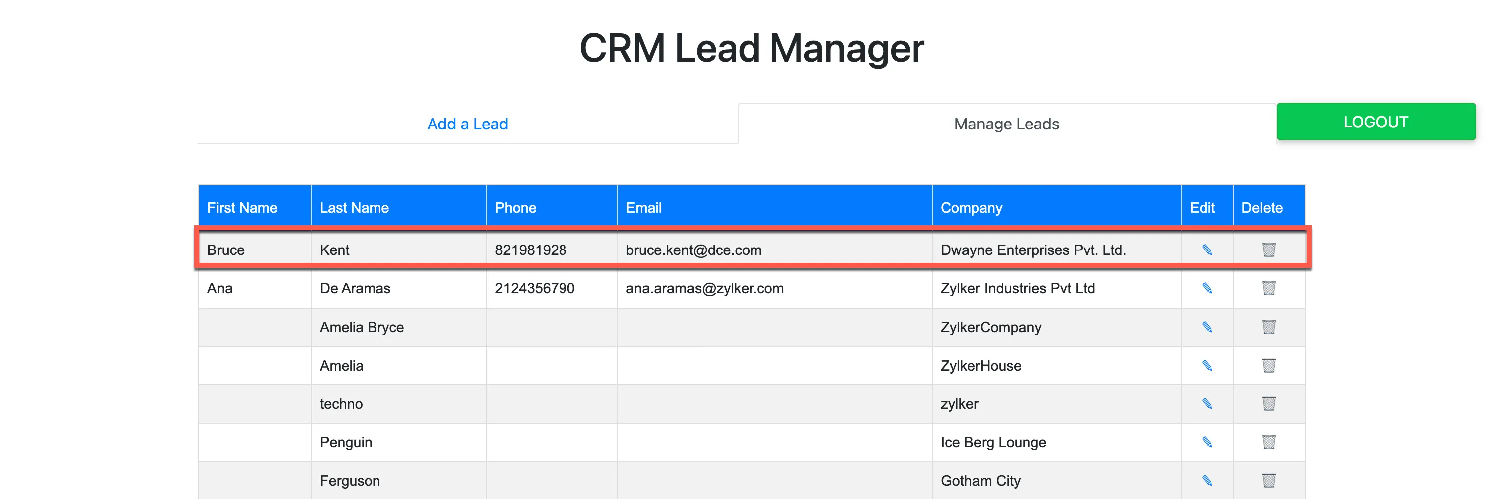 You can click the Manage Leads tab to view all your leads from the Leads module. You can edit or delete any of them by clicking their respective icons in the table.