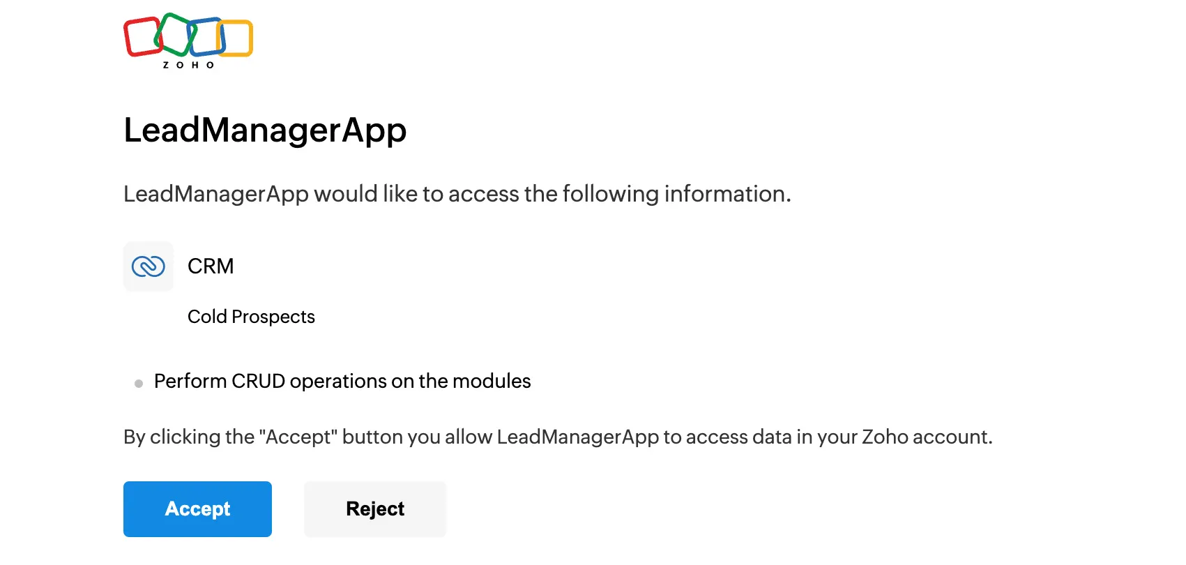 All your existing developer, sandbox, and production accounts will be listed. Click Accept to allow the Lead Manager app to access your Zoho CRM modules.