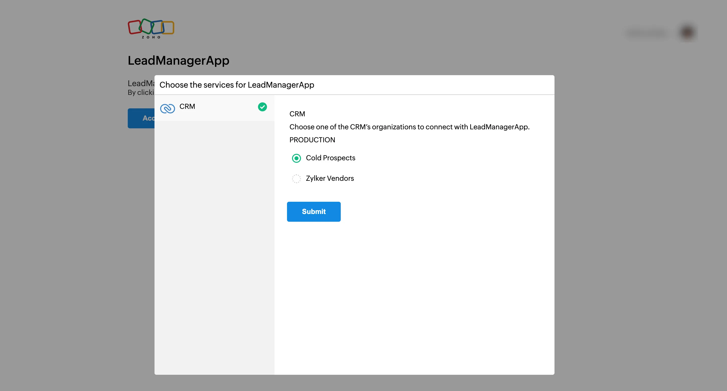 You must now choose the CRM account that you wish to connect with the Lead Manager app, then click Submit.