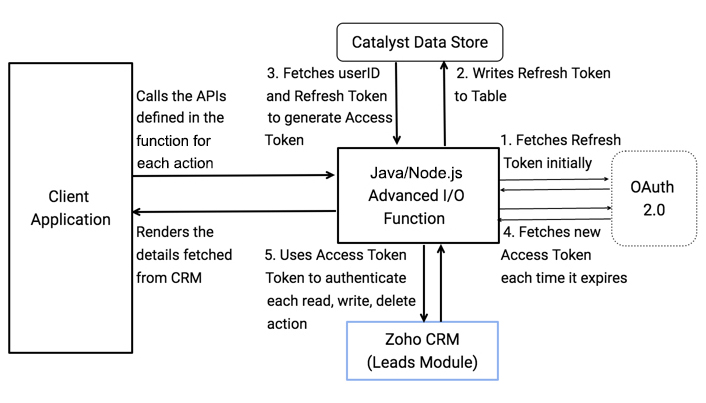 • Advanced I/O Function: The Advanced I/O Function is coded in the Java programming environment. The function defines the APIs that handle the CRUD actions of the CRM Leads module, such as adding or deleting a lead, from the client application. It also defines routes that handle the connection to CRM, authenticate the user, and generate the OAuth tokens.