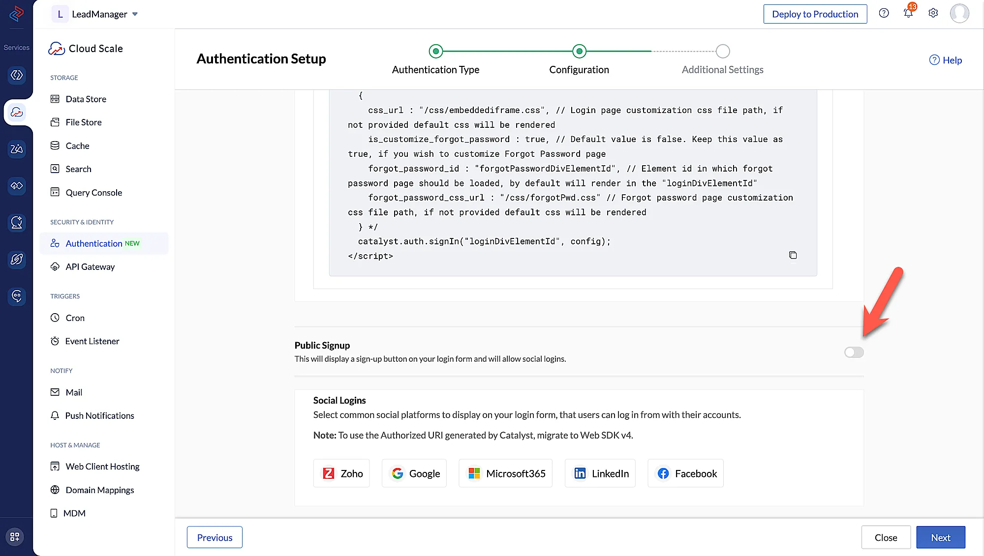 In the Authentication Setup page, enable Public Signup and click Zoho.