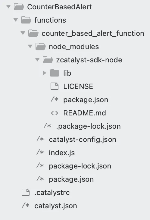 The functions directory will be created in your project directory with the configuration files and dependencies, along with the catalyst.json and a hidden .catalystrc file.