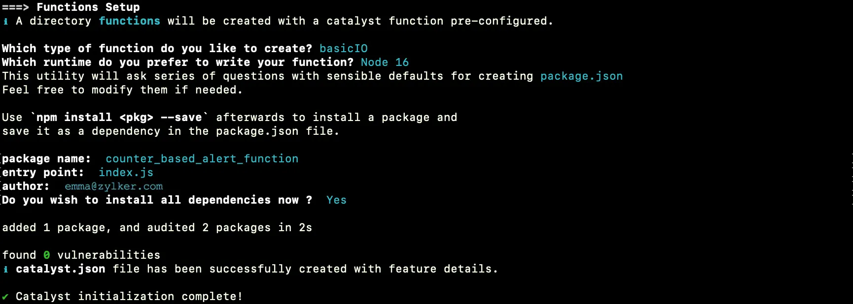 Enter “counter_based_alert_function” as the package name, “index.js” as the entry point, and your email address as the author and press Enter. You can alternatively press Enter without entering inputs to fill in the default values. The CLI will prompt the initialization of the Node dependencies. Press Y to confirm the installation, and press Enter to confirm your choice. The Node modules will be installed.