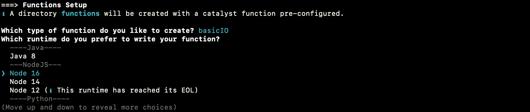 The CLI will initiate the functions set up. Select the BasicIO type from the list to set up and press Enter. You can learn about the function types from the Functions help page.