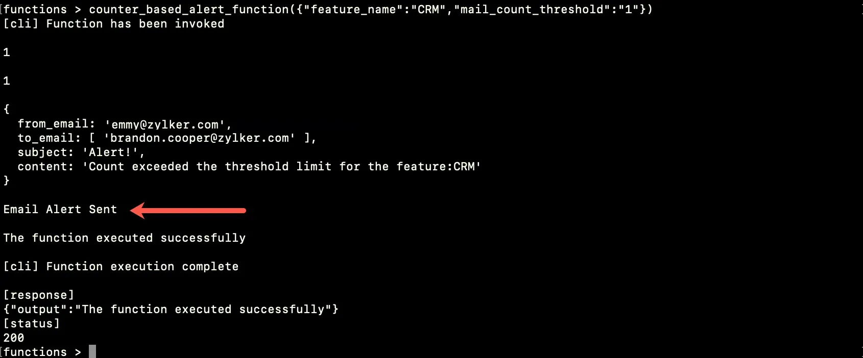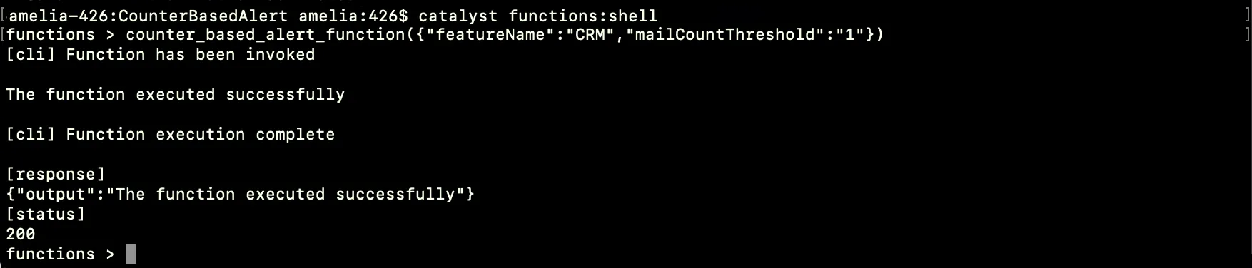 Let’s test the counter_based_alert_function by passing the input values for feature_name and mail_count_threshold. Execute this command in the function shell: