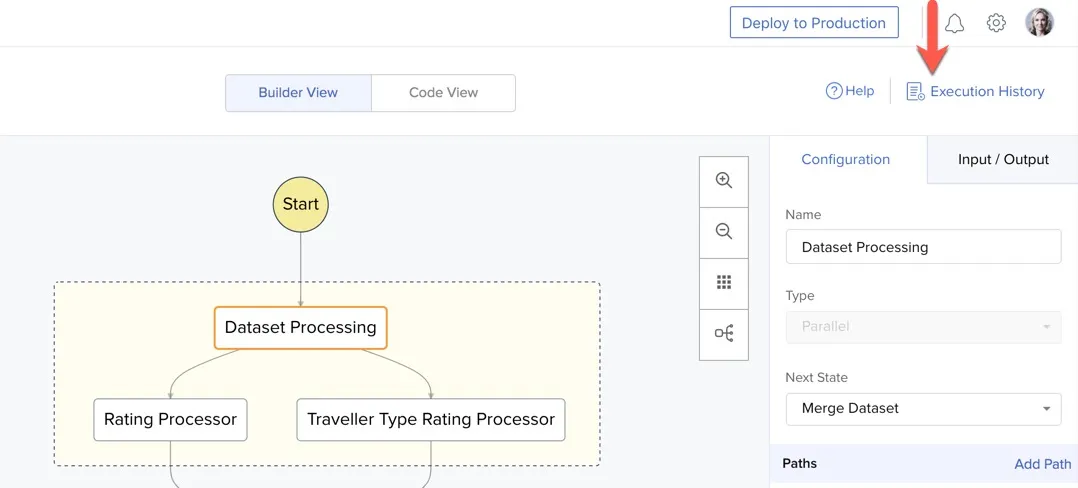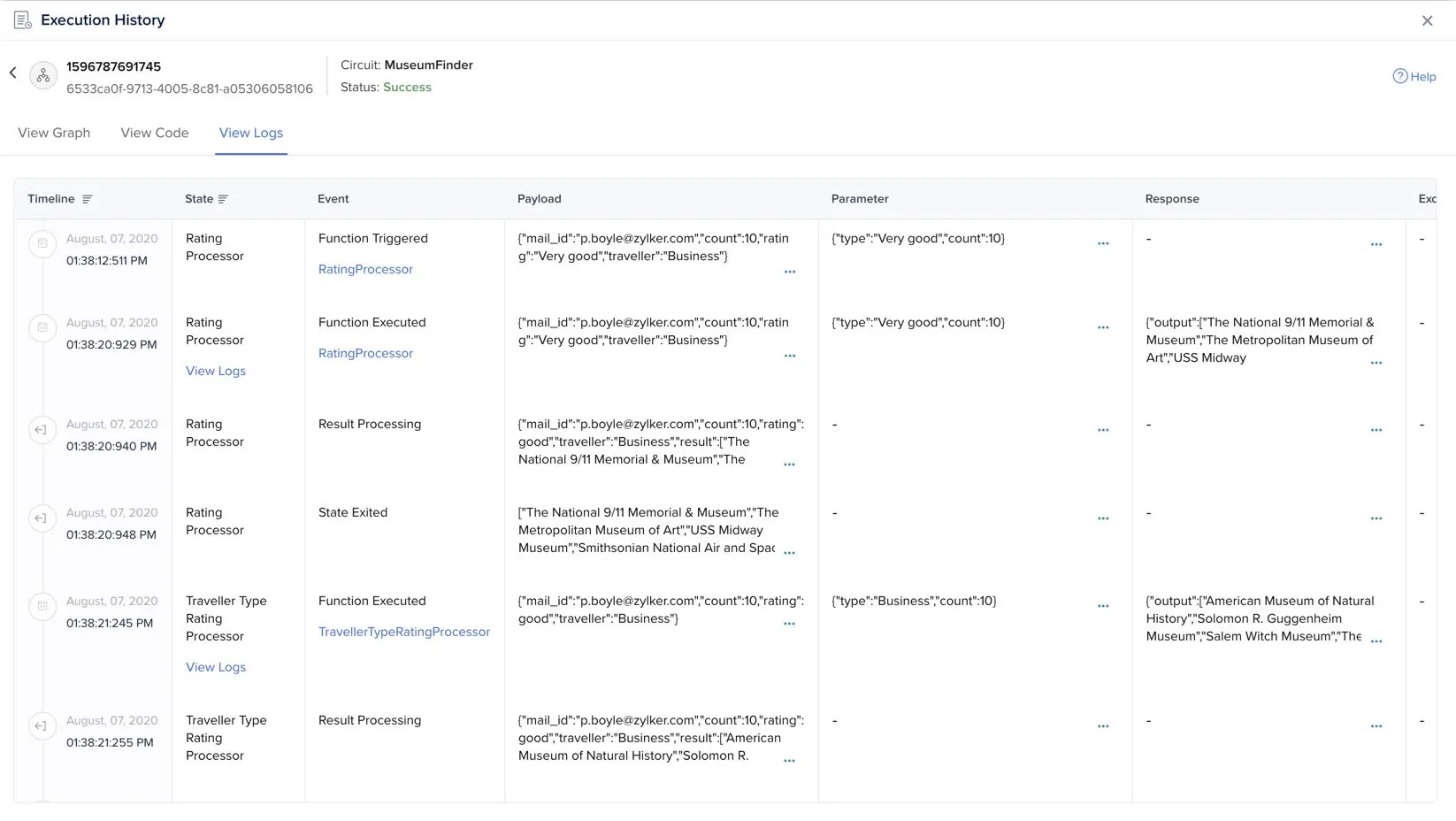 You can access a detailed execution log by clicking View Logs. This displays every event that occurred in each state, the payload and parameters passed, exceptions generated, and more.