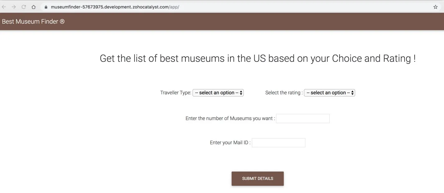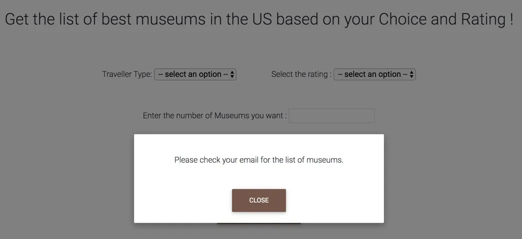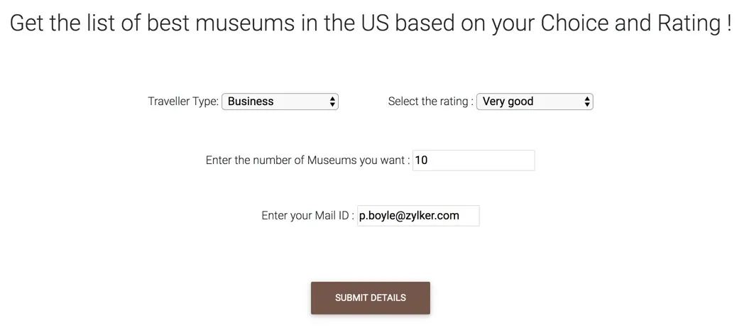Select values for traveller type and rating from the drop-down lists. Enter the value for museum count and an email address to receive the email. Click Submit Details.