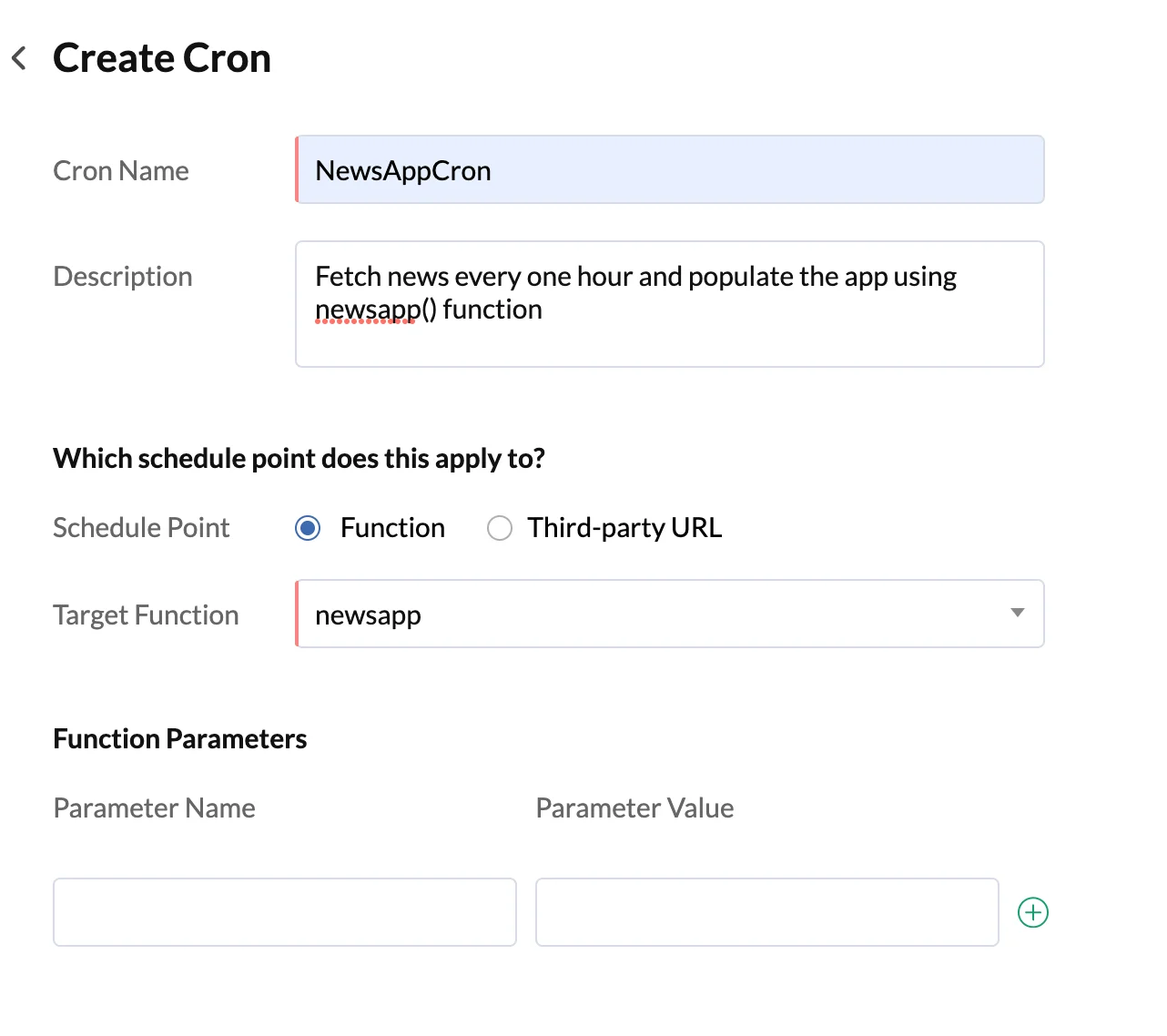 - Enter a name and a description for the cron. You can enter any name. Select Function as the Schedule Point and select the NewsApp function.