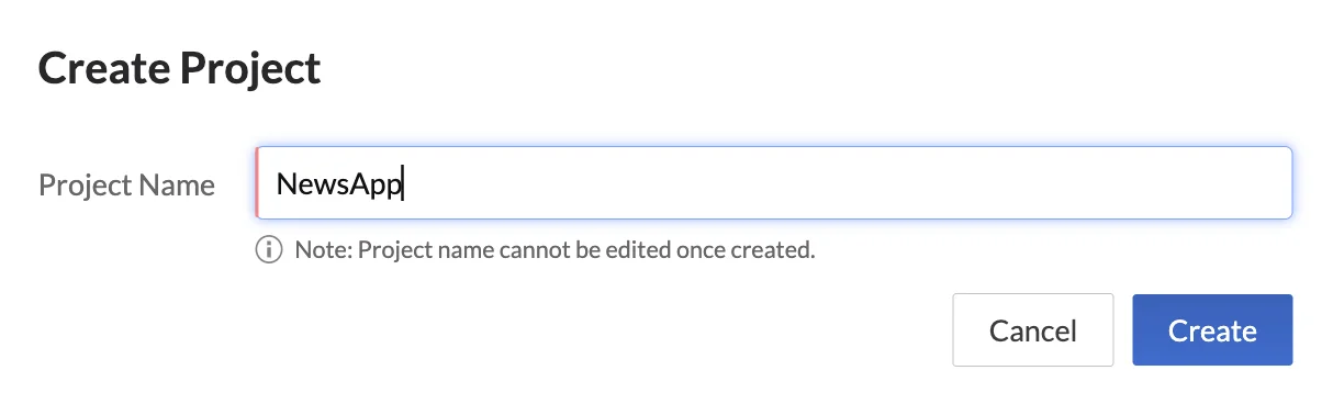 Enter the project’s name as “NewsApp” in the pop-up window and click Create.