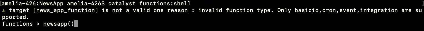 Now open the functions shell in your CLI by executing the following command from your project directory (CATALYST_PROJECT_HOME):