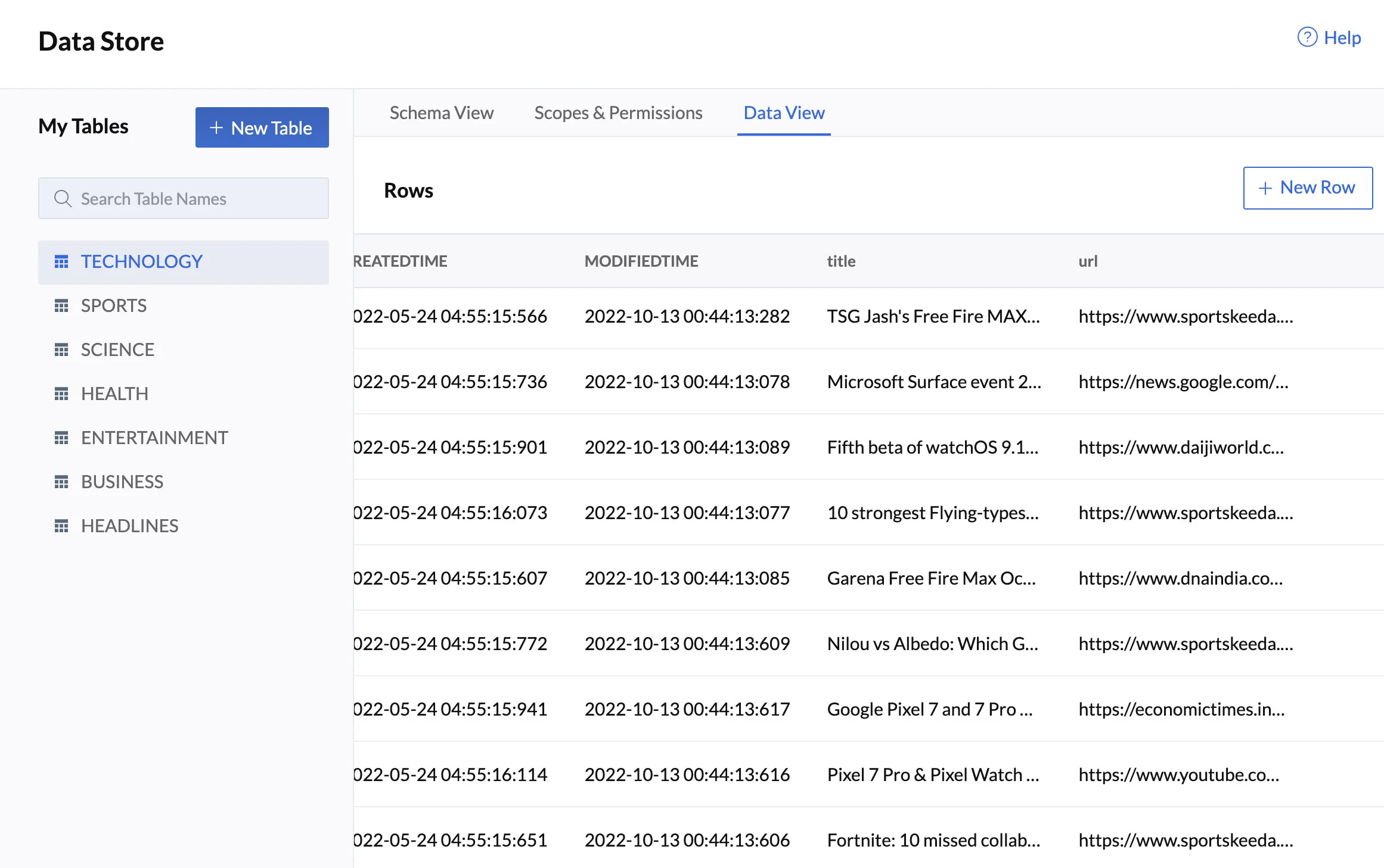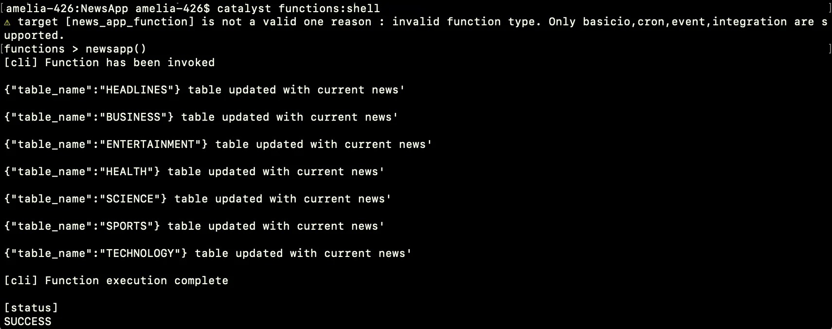 The function’s execution status is returned as success. This will make the API call to NewsAPI and fetch the news items from each category, and populate them in the Data Store.