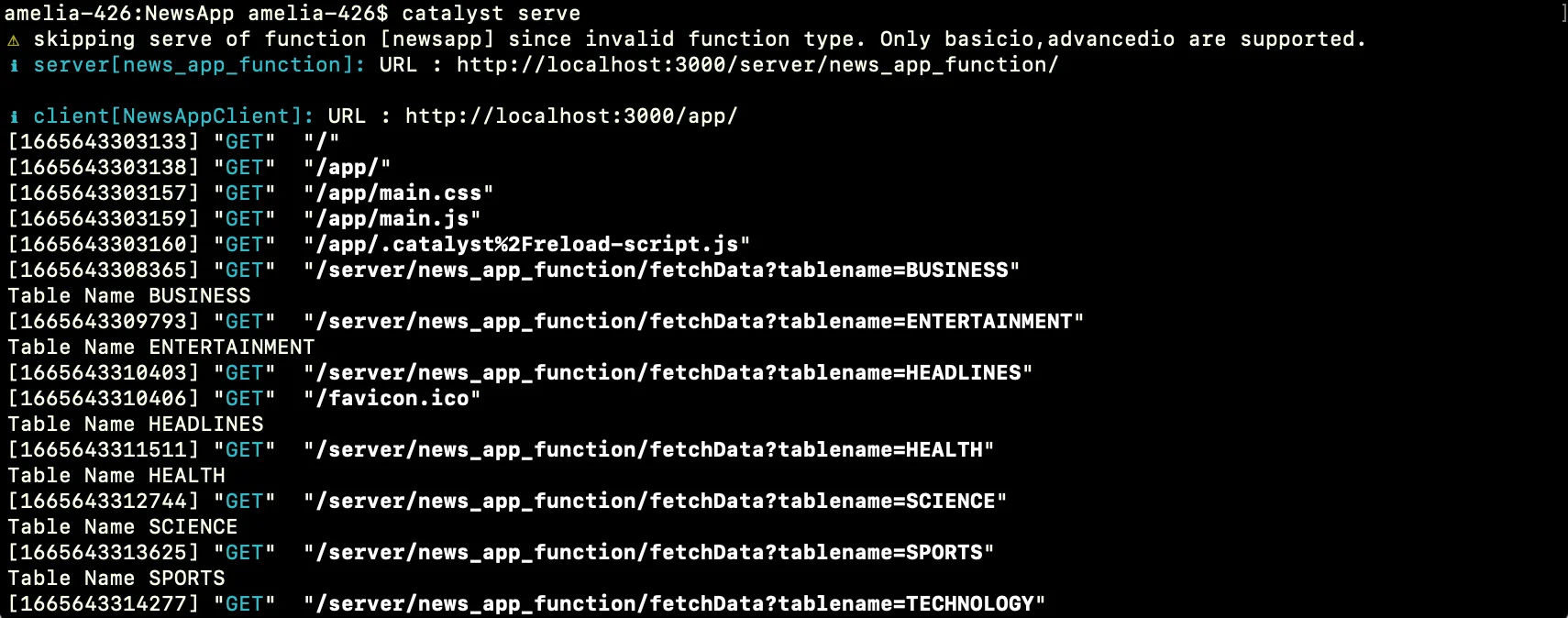 The news application will now be served at default port 3000. The local endpoint URLs of the components (the client and the Advanced I/O function) are displayed.