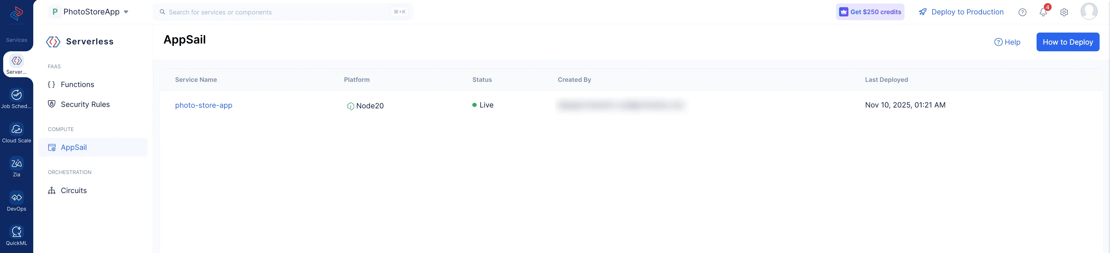 You can access the AppSail service in the console by navigating to the AppSail component present in the Catalyst Serverless section.