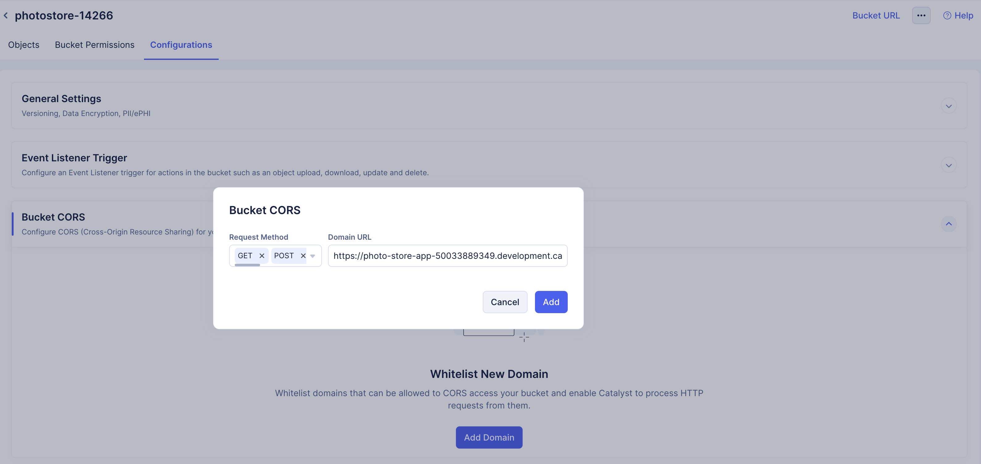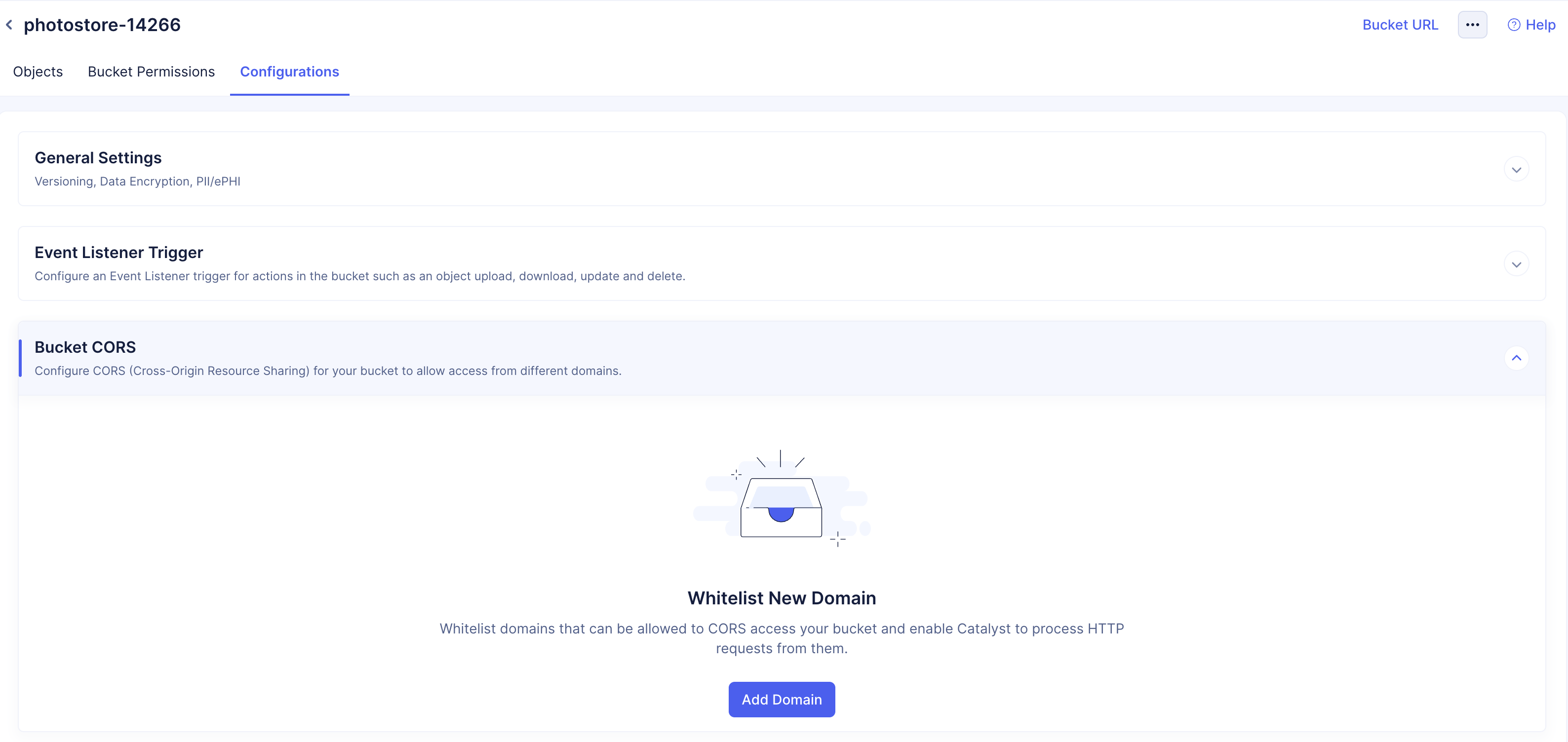 Navigate to the Bucket CORS section present in the Configurations tab, and click Add Domain.