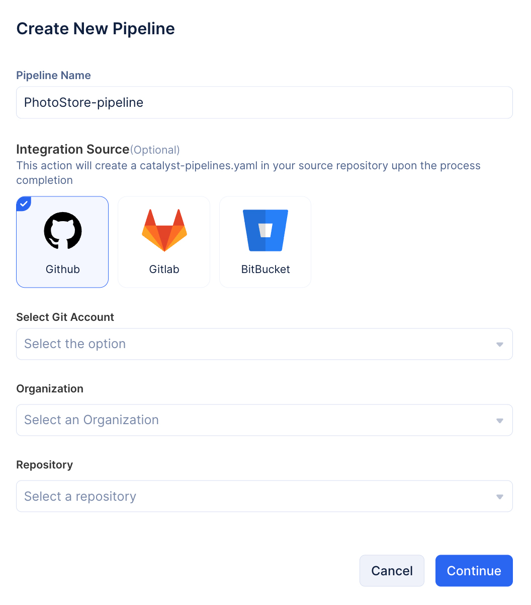 Name your pipeline as “PhotoStore-pipeline” and select GitHub as the integration source.