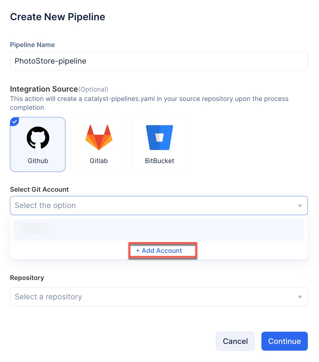 Add your GitHub account from the drop-down. If you haven’t added it previously, you can click the +Add Account button and follow the login steps to add the GitHub account to the Catalyst Pipelines service.