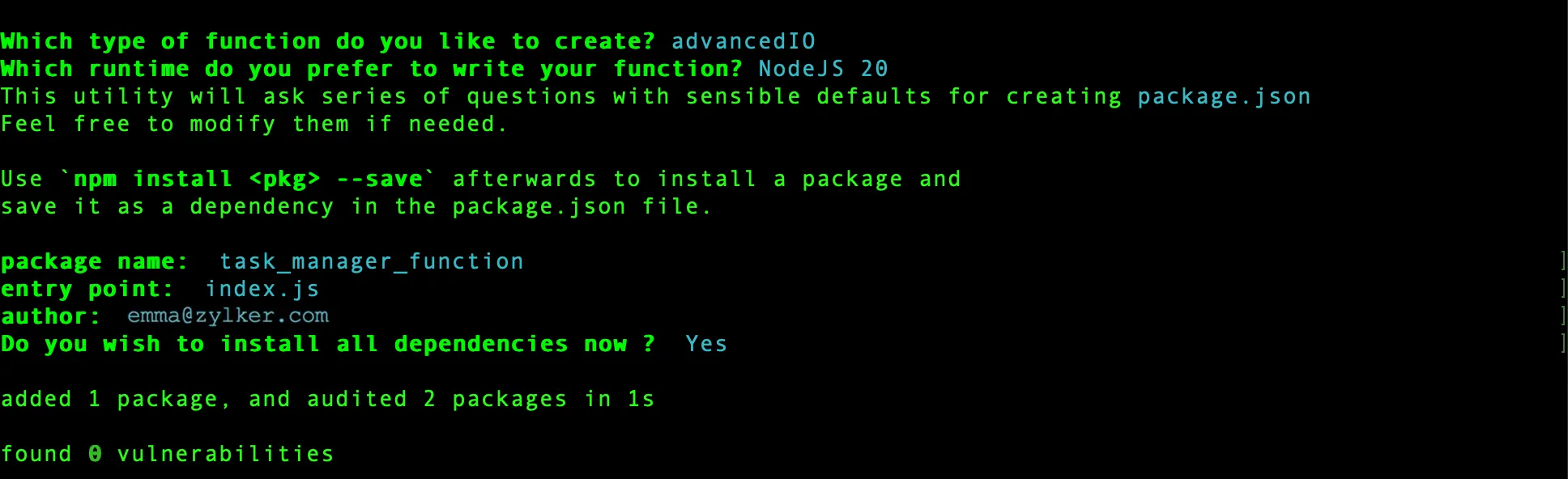 Enter “task_manager_function” as the package name, “index.js” as the entry point, and your email address as the author, then press Enter. Alternatively, you can press Enter without entering inputs to fill in the default values. The CLI will prompt the initialization of the Node dependencies. Press Y to confirm the installation, and press Enter to confirm your choice. The Node modules will be installed.