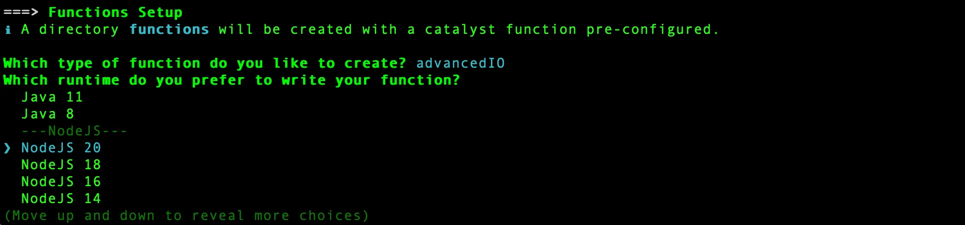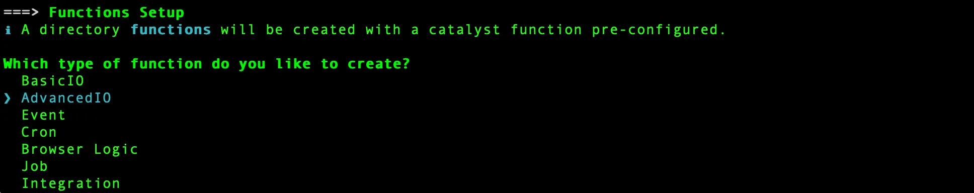 The CLI will initiate the function setup. Select Advanced IO as the function type to code your backend logic.