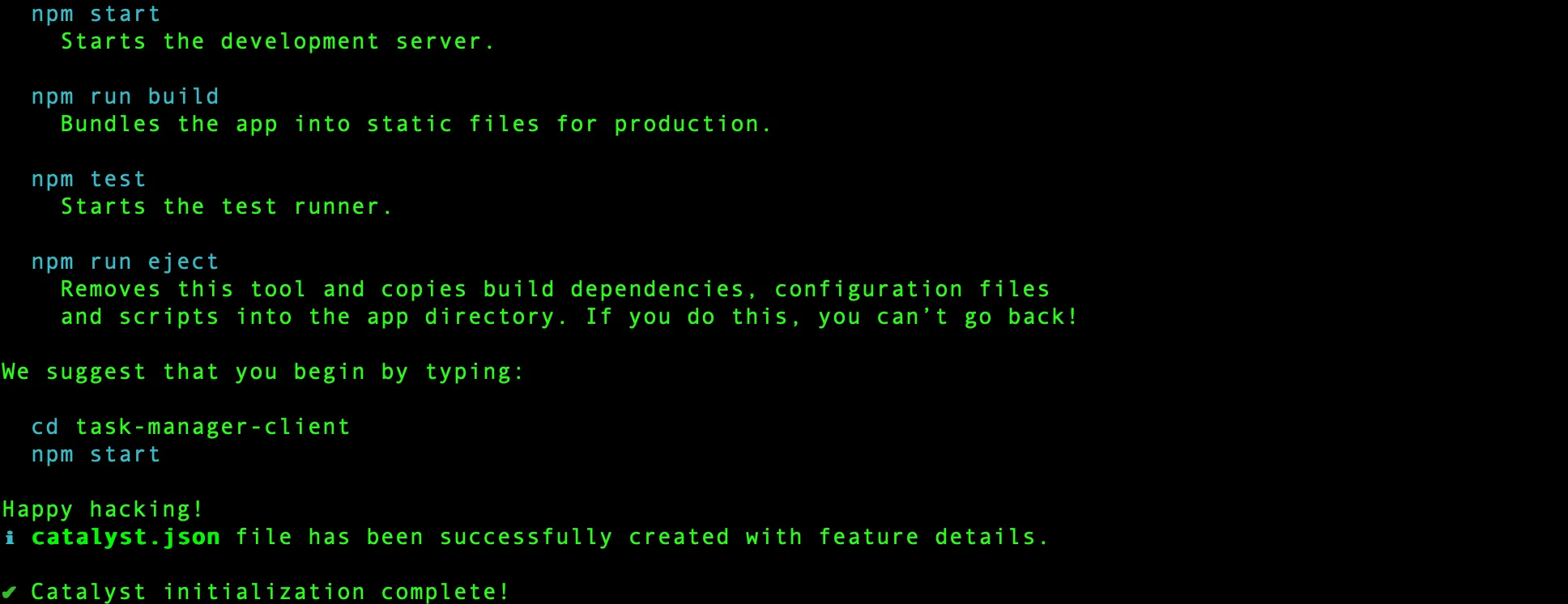 You can now begin working on your Catalyst project from the CLI. The first step is to initialize the project in an empty directory. This will be the home directory of your project, and all of the project files will be saved in it.