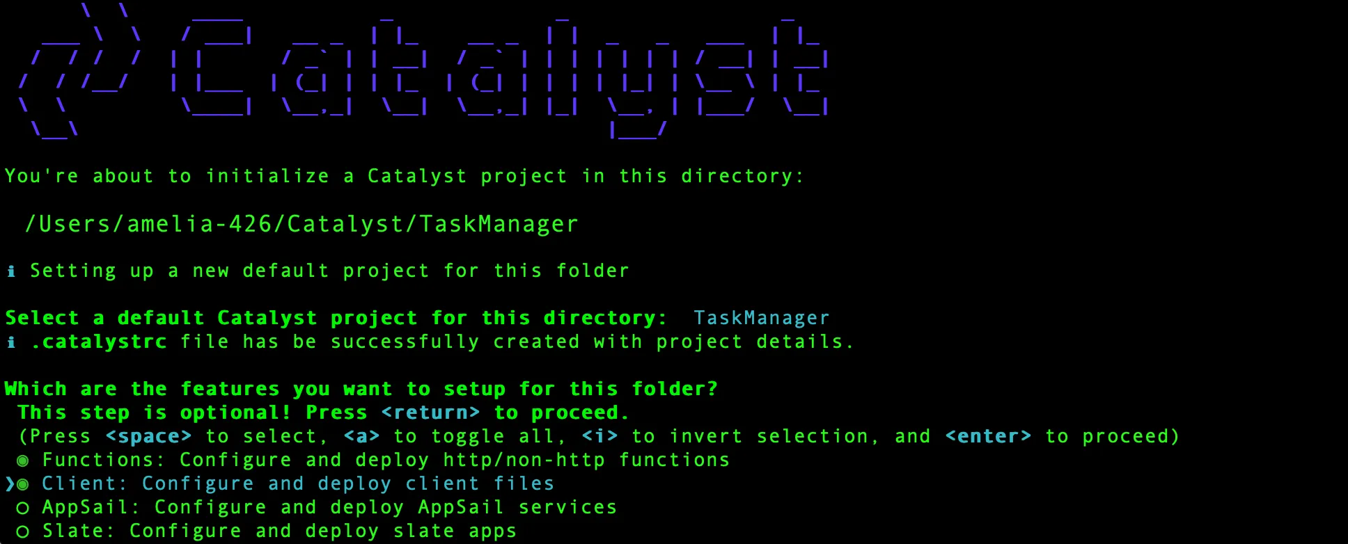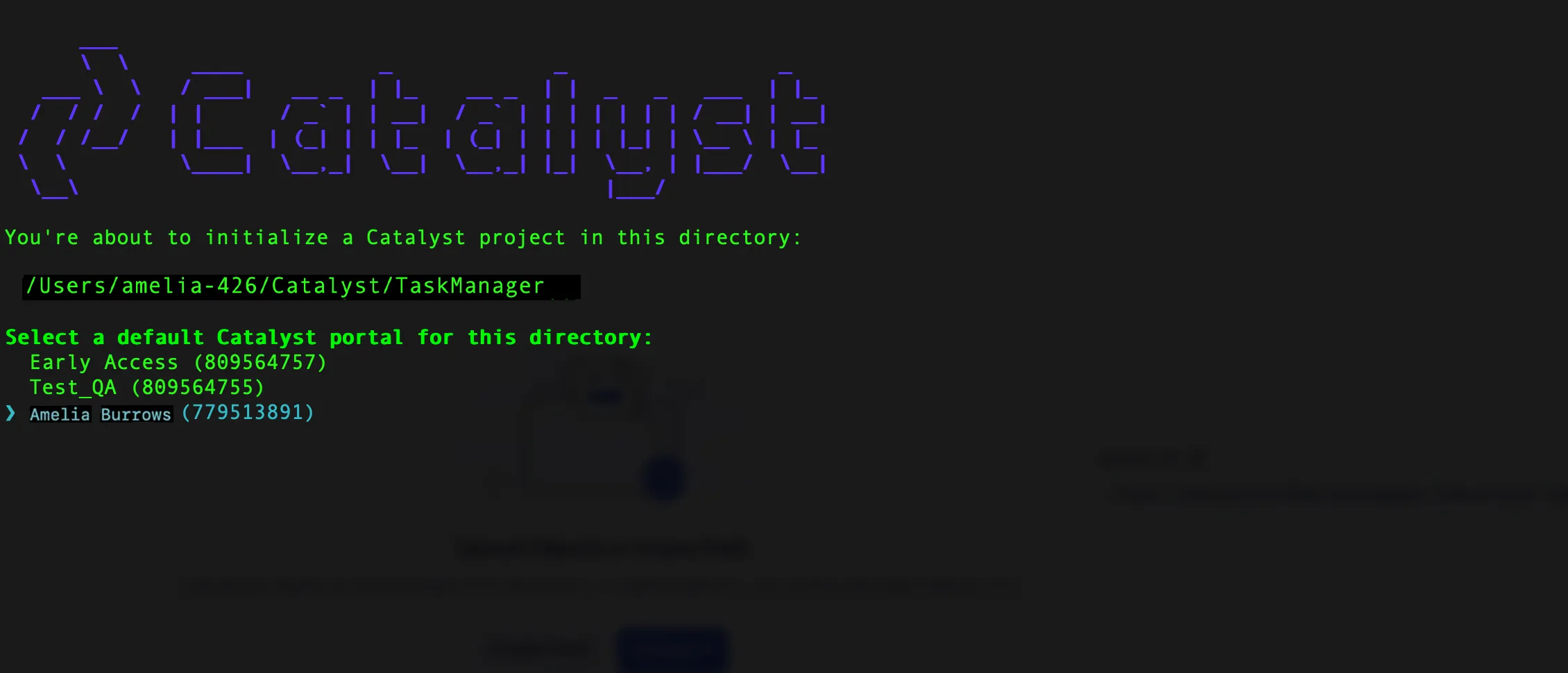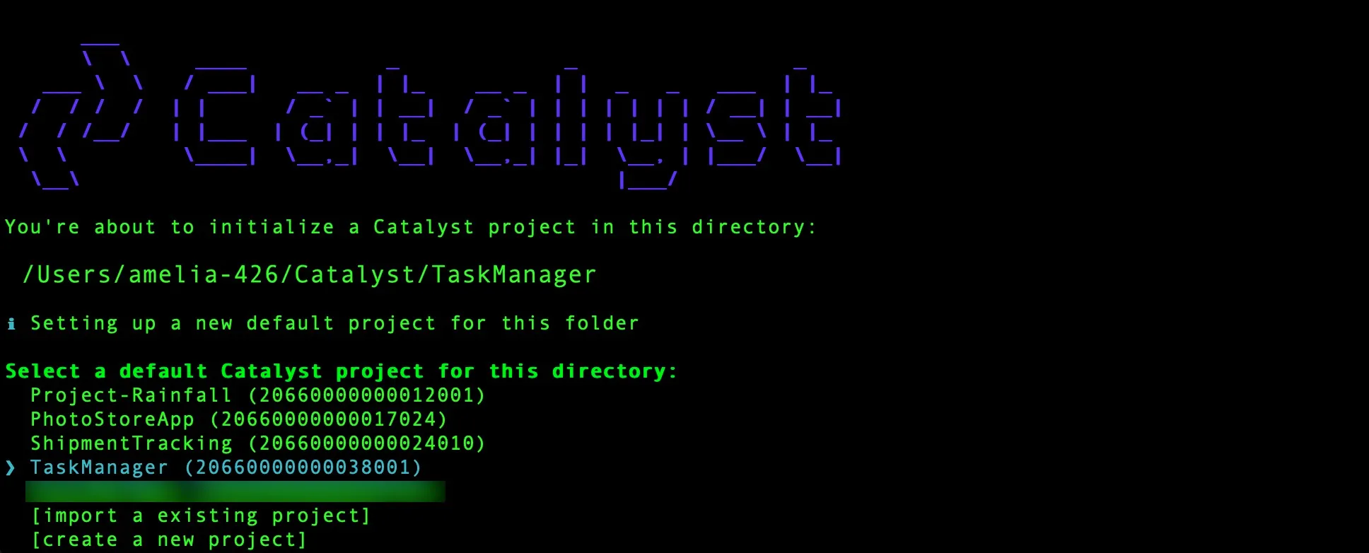 The CLI will now ask you to associate a Catalyst project with the directory. Associate it with the project that we created earlier from the console. Select TaskManager from the list and click Enter.