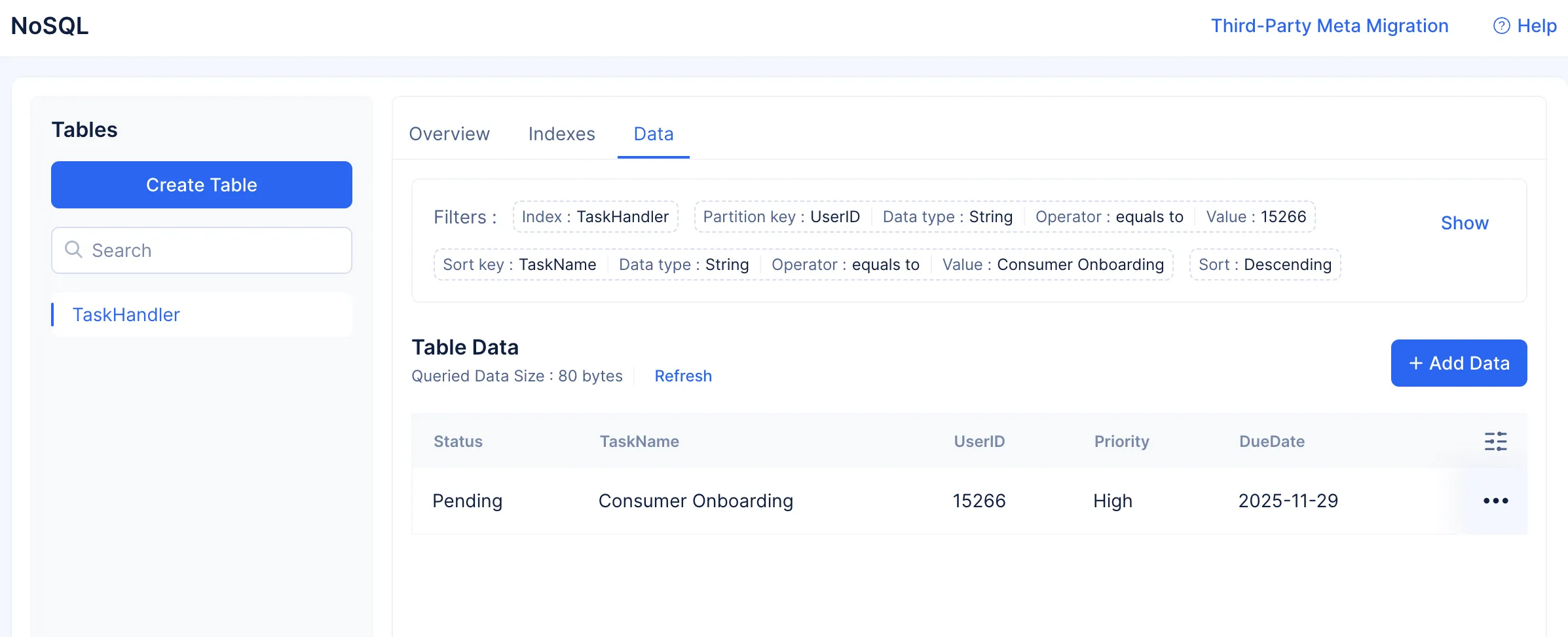 The task will be created. You can verify, if your task has been created by searching for the data in the NoSQL table present in the console.