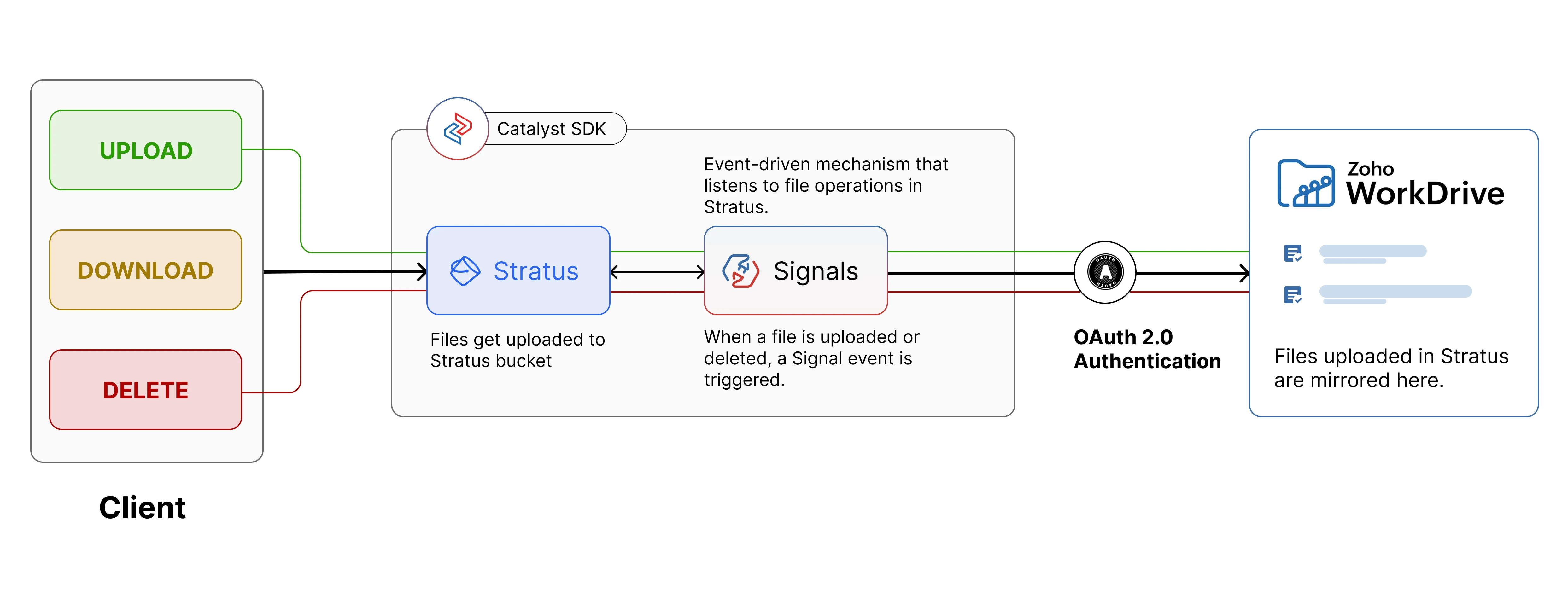 This tutorial enables synchronization between two folders in your project’s bucket present in Stratus and in your WorkDrive, respectively. You can upload the files through the client application that you will build in this tutorial. The file will be uploaded in the required Bucket, then made available in WorkDrive automatically. This synchronization is automated through an event-driven architecture implemented using Catalyst Signals.