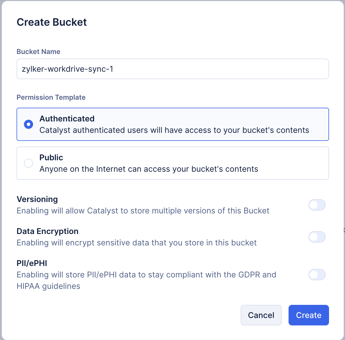 - Enter the bucket’s name, ensure that the Permission Template is set as Authenticated and click Create.
