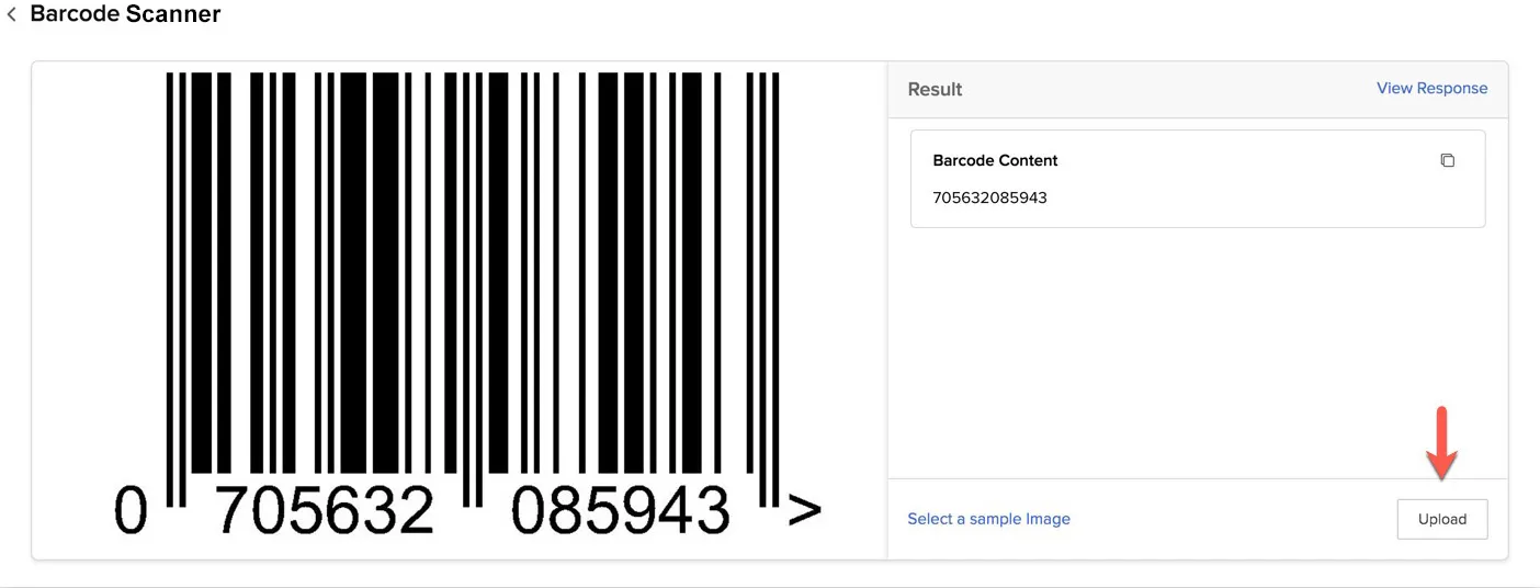 You can test Barcode Scanner by either selecting a sample image from Catalyst or by uploading your own image.