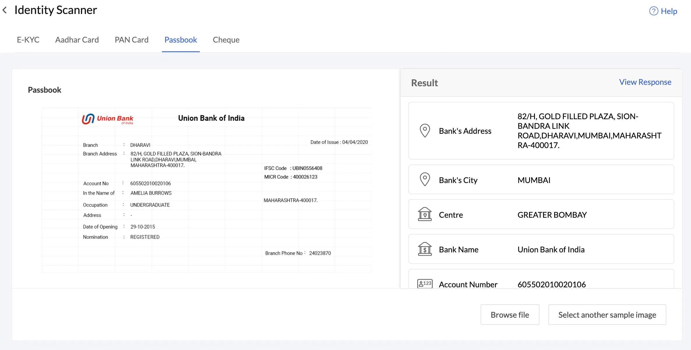 Click Select a Sample Image or Browse Files to upload a passbook’s front page image.