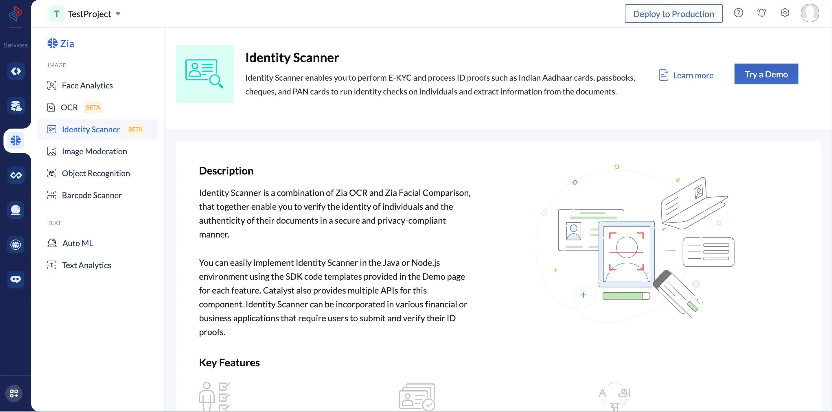 Navigate to Zia Services in the left pane of the Catalyst console and click Identity Scanner.